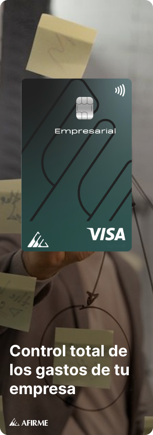 ¹ Las comisiones “Administración de tarjeta del titular” y “Administración de tarjeta adicional” serán aplicables a partir del segundo año por el monto de $500.00 pesos más IVA. ² AfirmeNet y Afirme Móvil: Servicios opcionales operados y otorgados por Banca Afirme. El servicio de AfirmeNet Básico se otorga de manera gratuita. Consulta términos, condiciones, requisitos de contratación y más información sobre el servicio aquí. ³ Servicios o seguro gratuito proporcionado por Visa. Consulta mayor información sobre los beneficios y coberturas que ofrece Visa a tu Tarjeta Empresarial aquí.